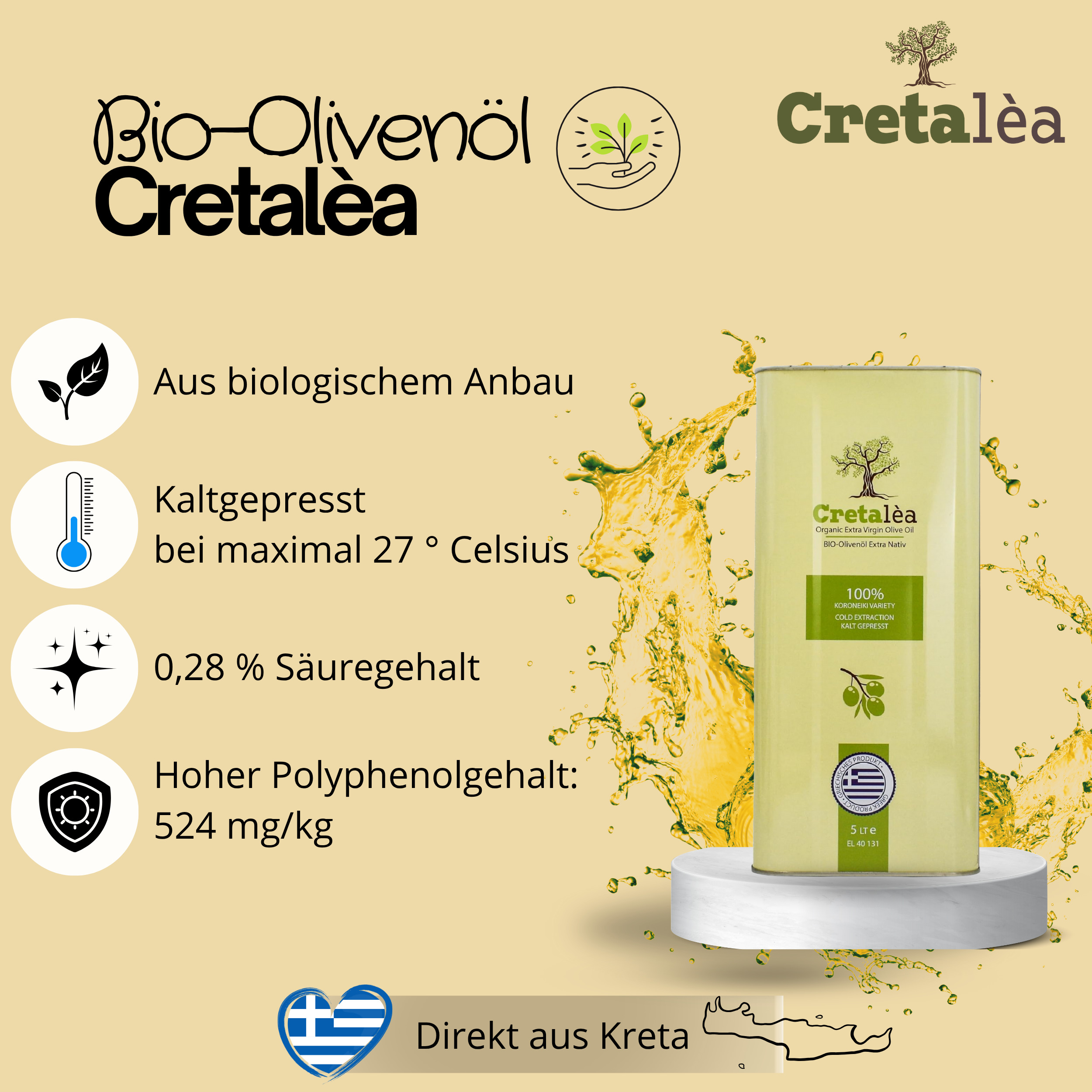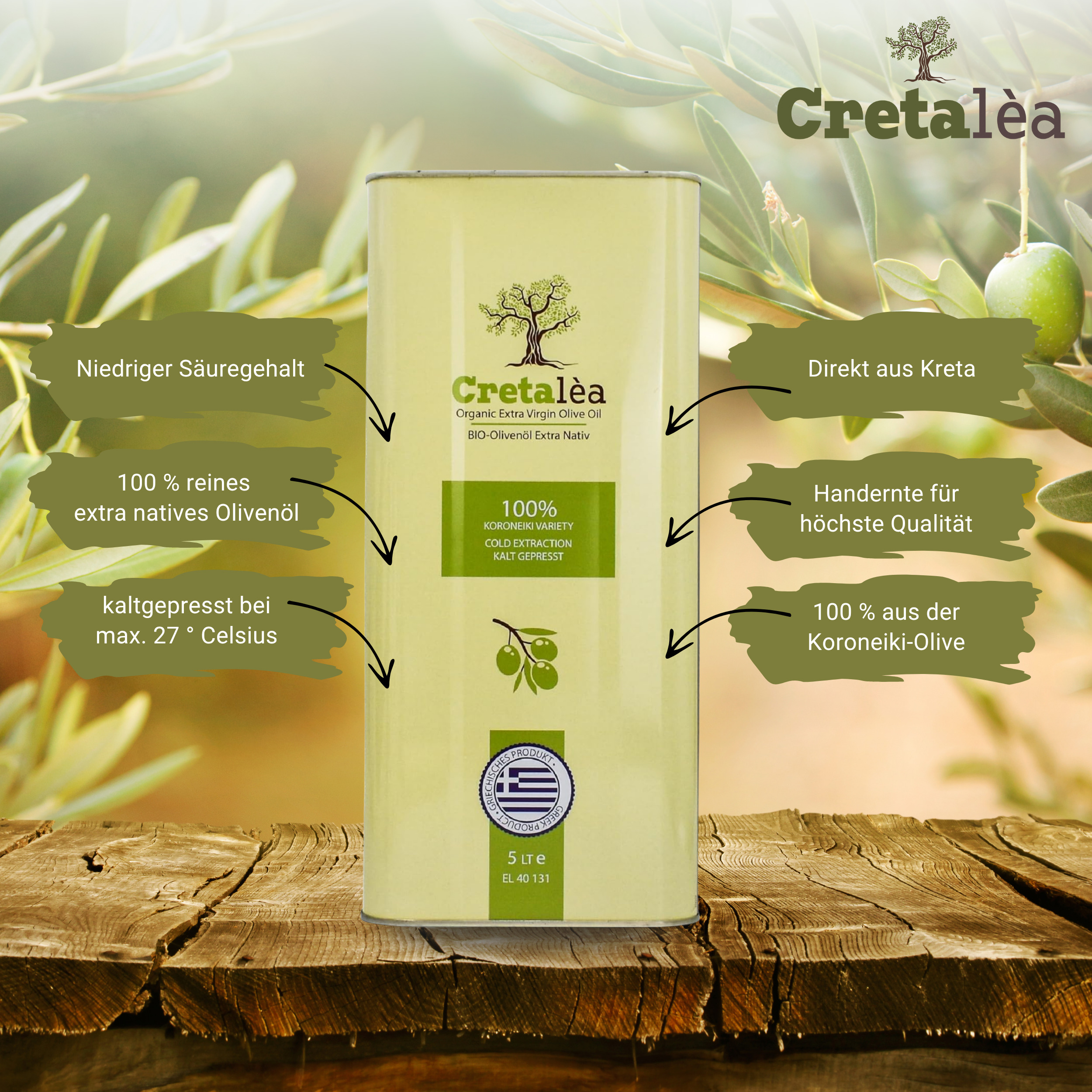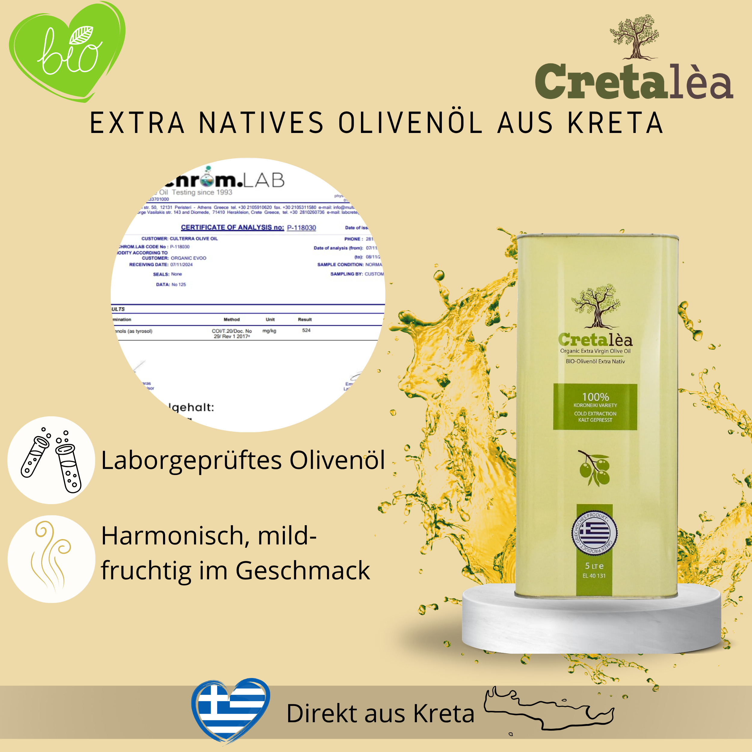 Olivenöl 5 Liter Bio - Extra Nativ aus Kreta, Griechenland - Cretalea - Neue Ernte, erste Güteklasse - kaltgepresst